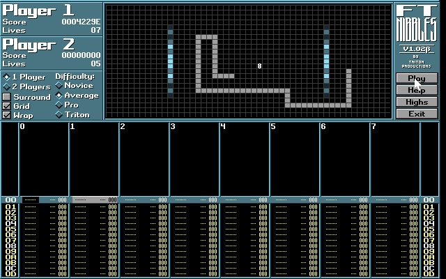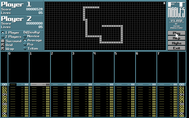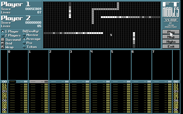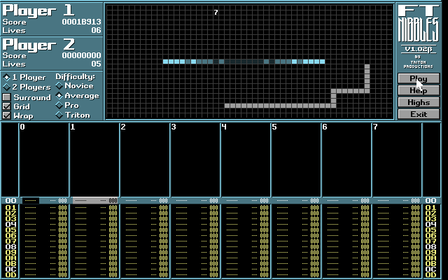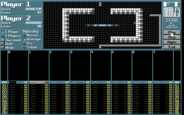 This is a Nibbles variant for one or two players, built into the Fasttracker II music tracker by the Swedish demo group Triton.
