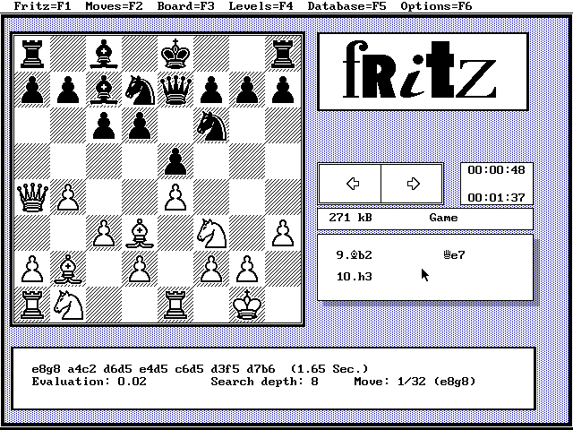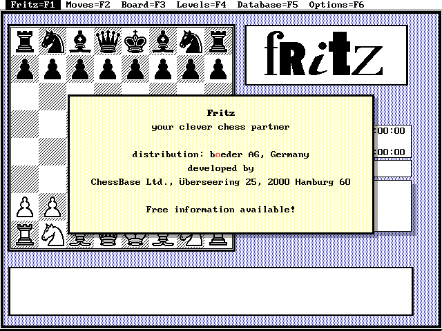 The DOS version of Fritz was developed by Dutch author Frans Morsch in collaboration with the German ChessBase team. Originally sold as a commercial product, this version 1.00 of Fritz has been made available for free with the kind permission from ChessBase. Please visit their website for the most up-to-date chess products and other chess-related information.