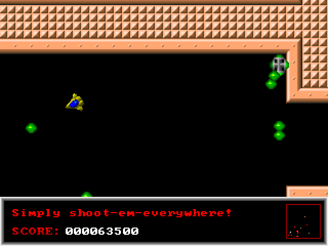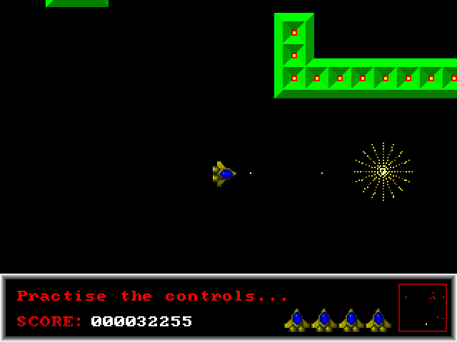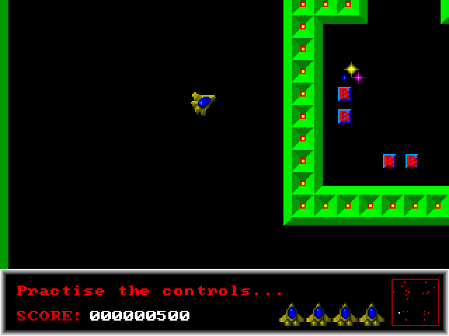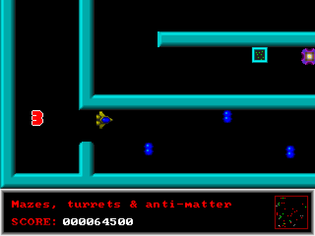 The main difference from the typical shooter/maze game of this kind is that your ship is affected by inertia and there are no reverse thrusters, making the movement somewhat erratic. Anything that hits the ship instantly destroys it, with only four spares initially available.