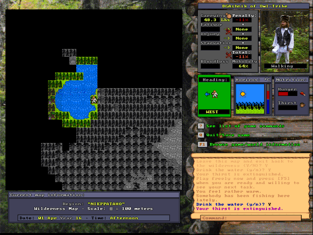 UnReal World is an in-depth wilderness survival roguelike based in the prehistoric North European neolithic setting. Highly customizable, it offers both sandbox gameplay and various preset scenarios (but still taking place in randomly generated worlds like roguelikes do) to enhance the experience. In all cases, the player character needs to survive and thrive in a world of dense forests full of wild beasts, vast lakes, caves and sparse villages.